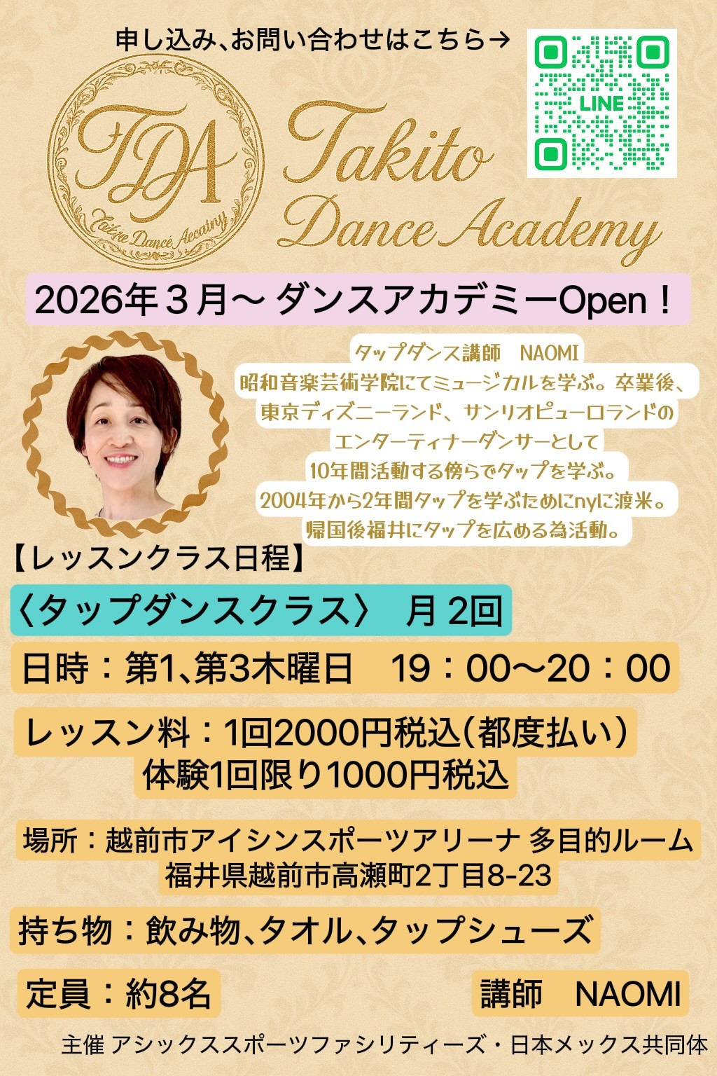2026年3月より、越前市出身でOSKで活躍されていました 瀧登 有真 さんが主宰する Takito Dance Academy によるダンス教室が始まります。