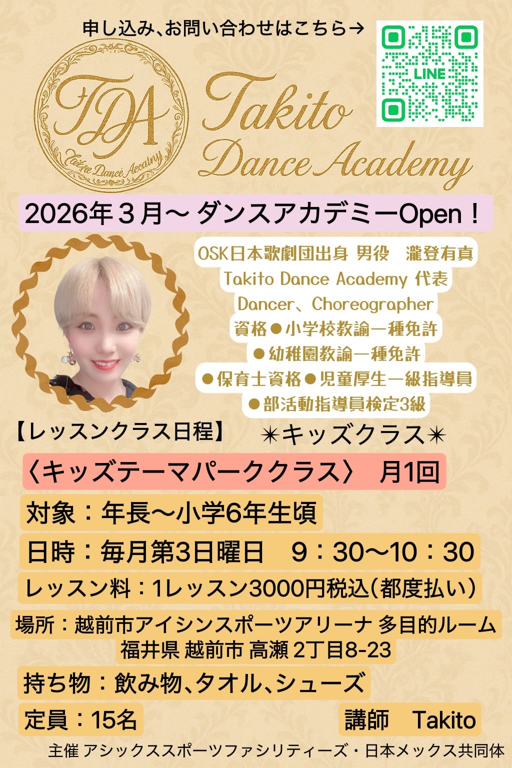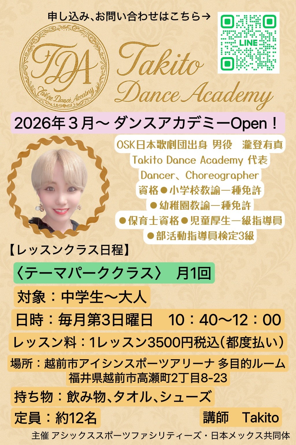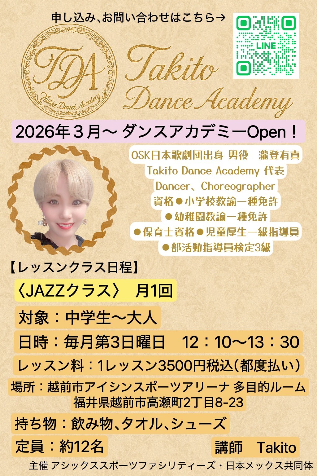 2026年3月、越前市出身のOSK日本歌劇団OG 瀧登有真 さんが主宰する Takito Dance Academy による新しい教室がスタートします。